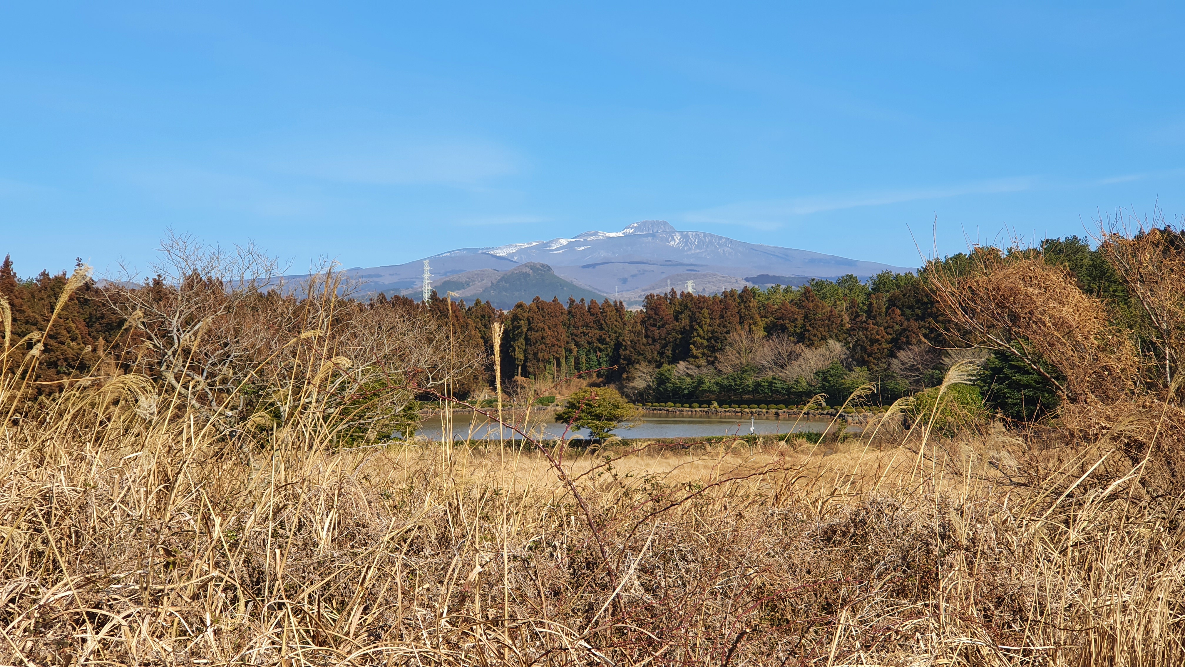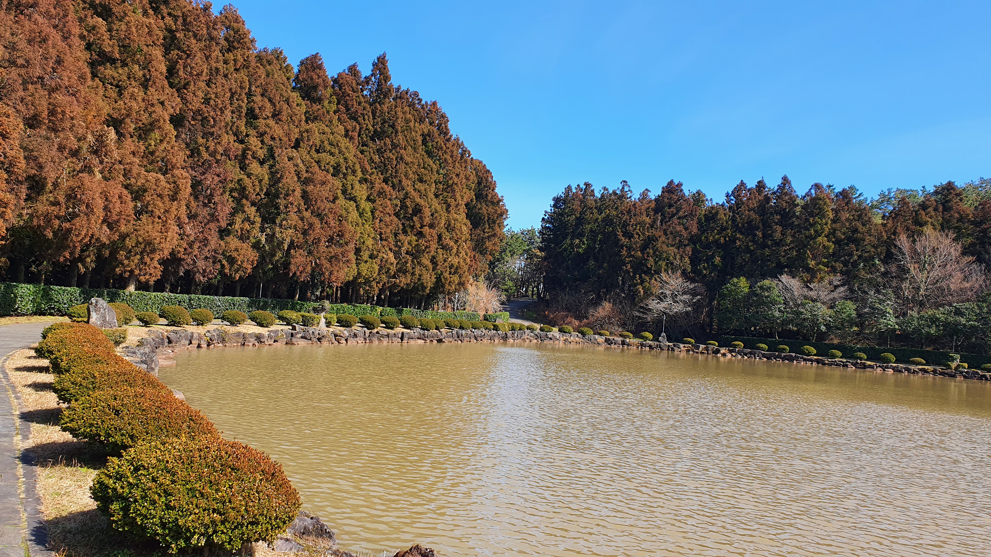 분화구 내 연못 둘레에는 인공적으로 조성한 삼나무 숲과 풀밭이 있으며