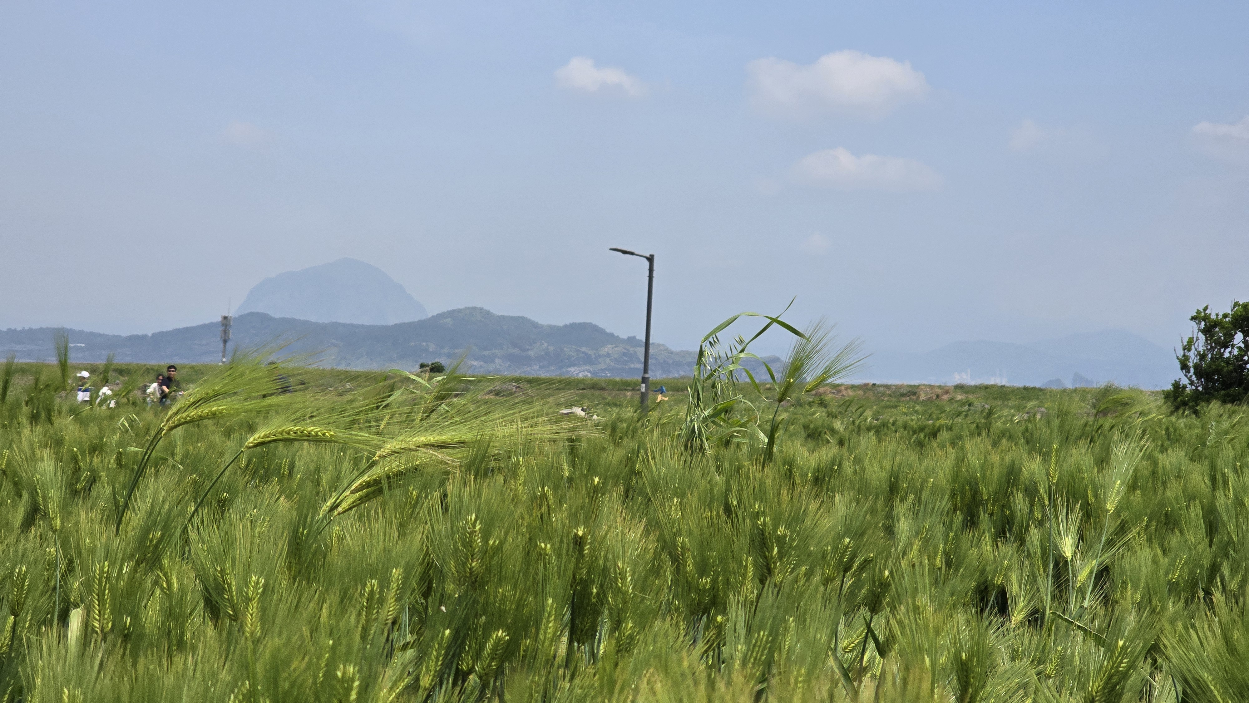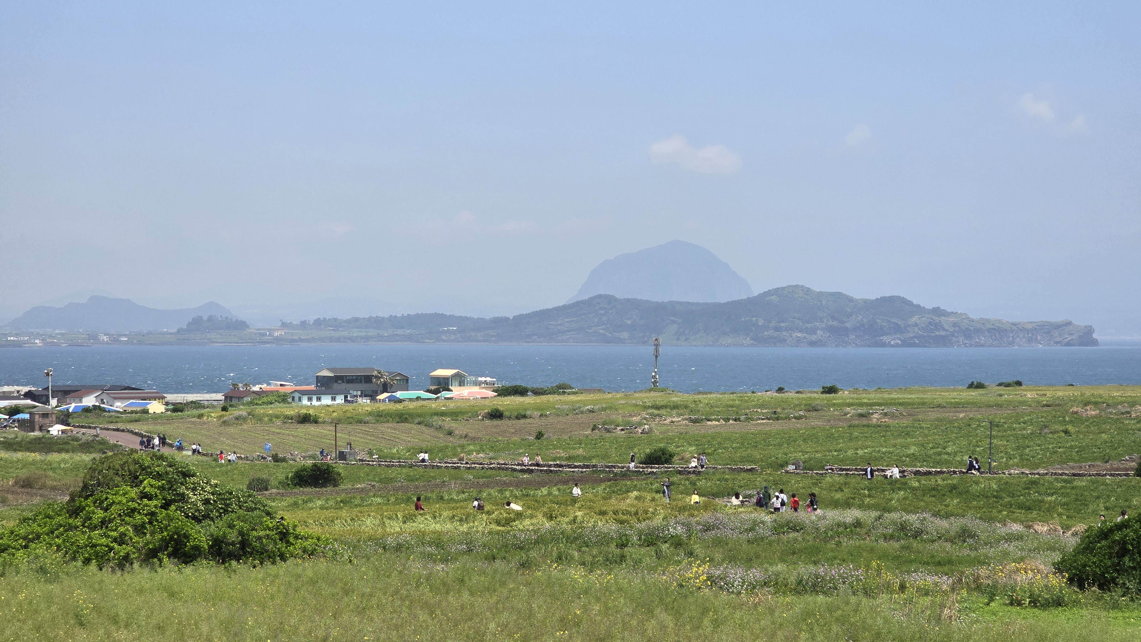 멀리 산방산과 한라산을 배경으로 푸른 벌판이 싱그럽다.