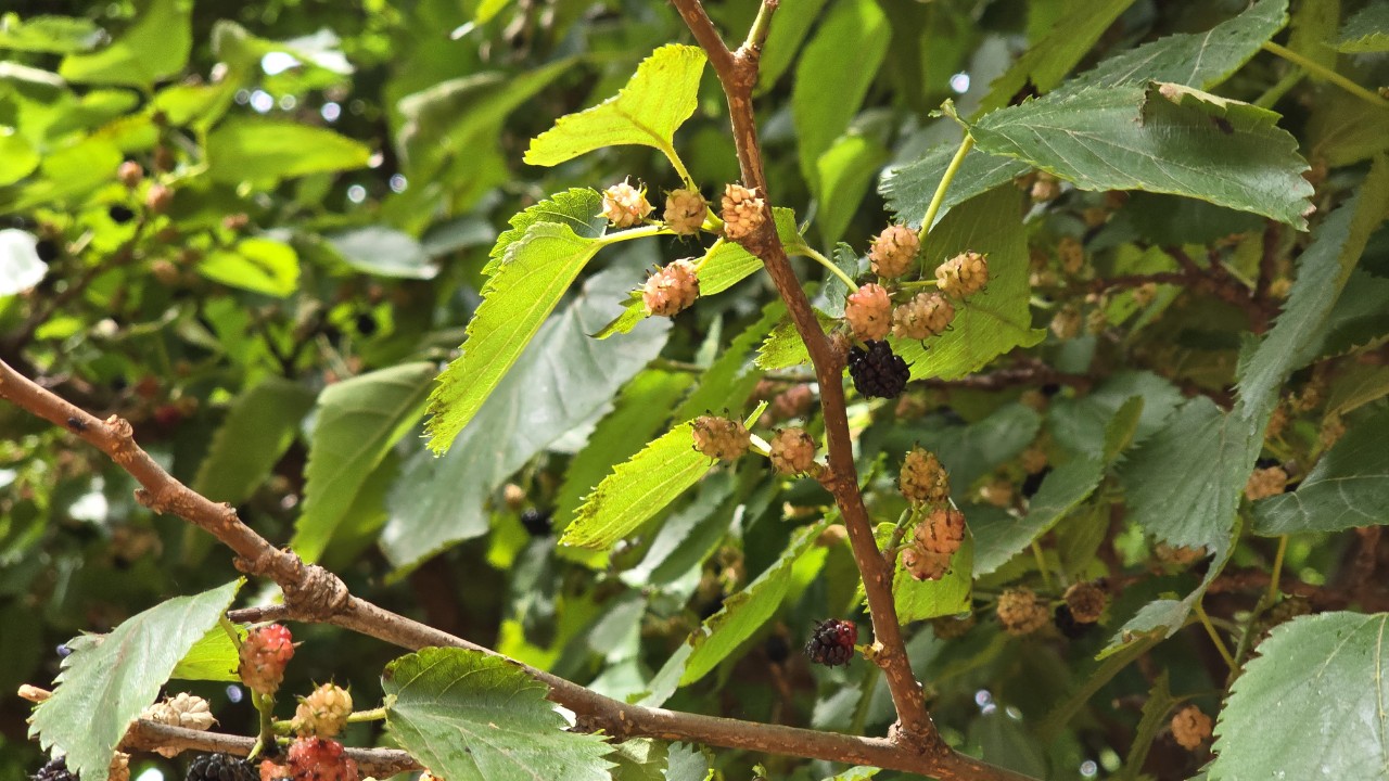 산뽕나무에 오디가 잔뜩 달려 있다.