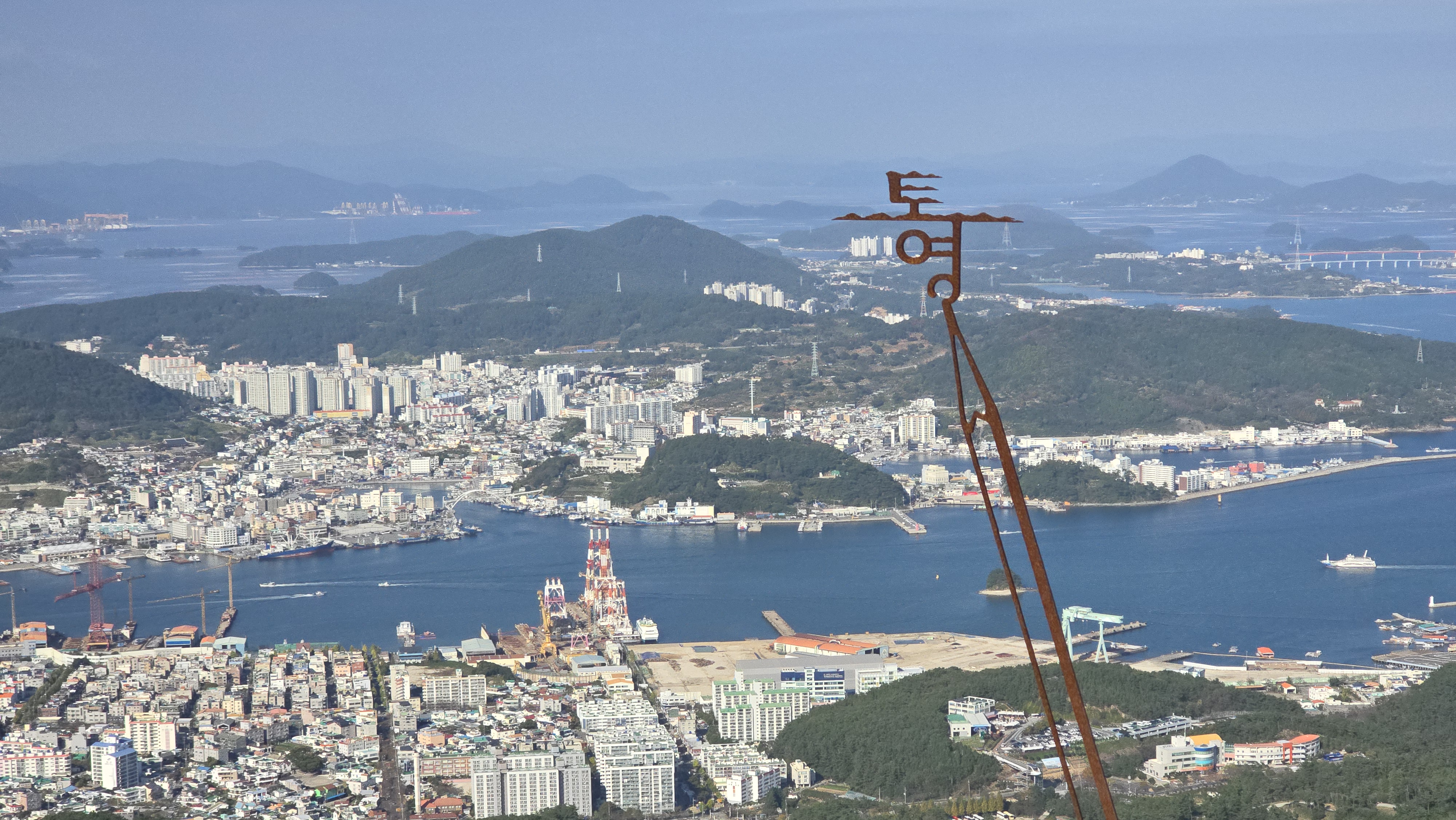 미륵산 정상에는 연필 끝에 "통영" 글자 모형이 있다.