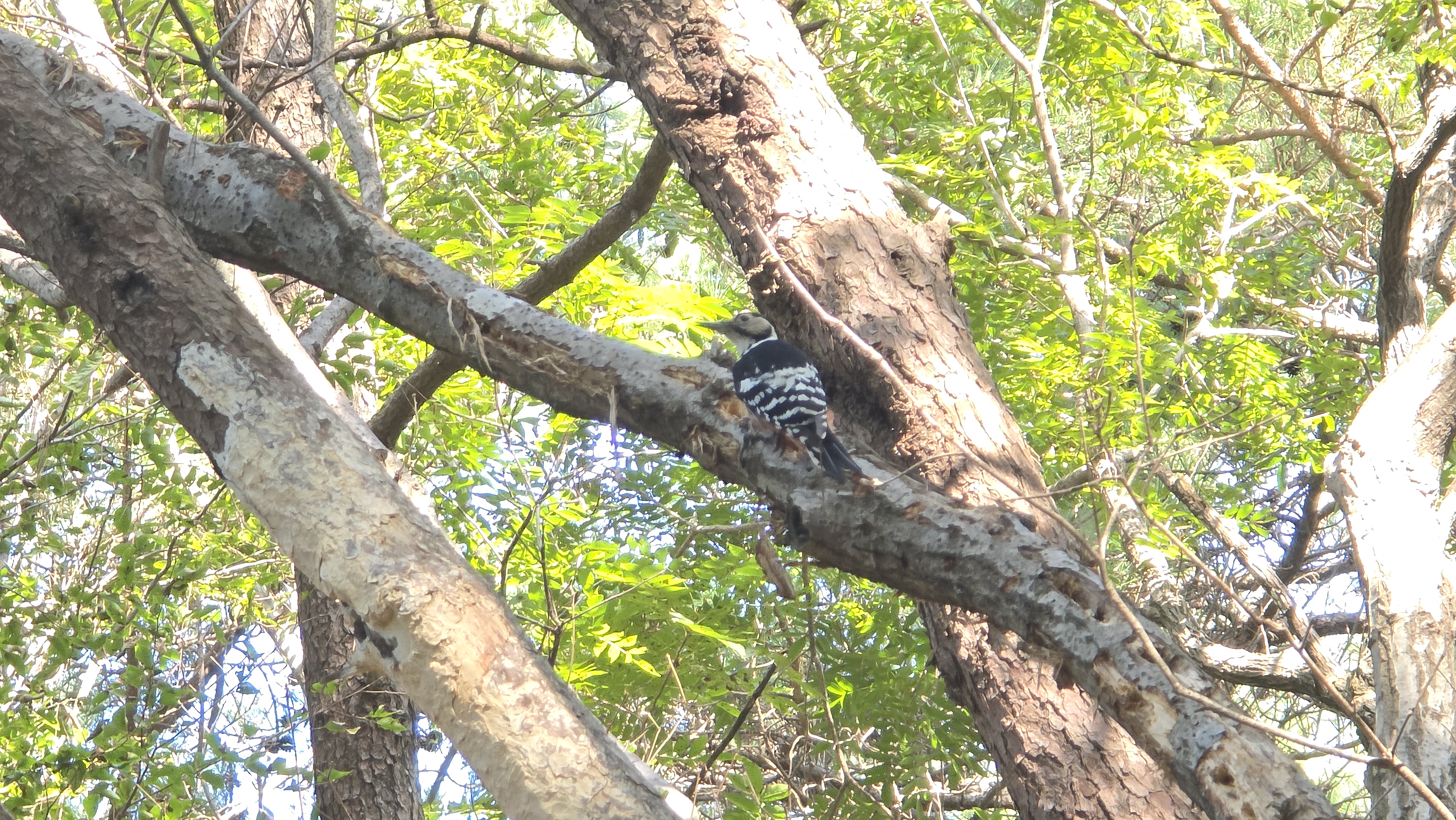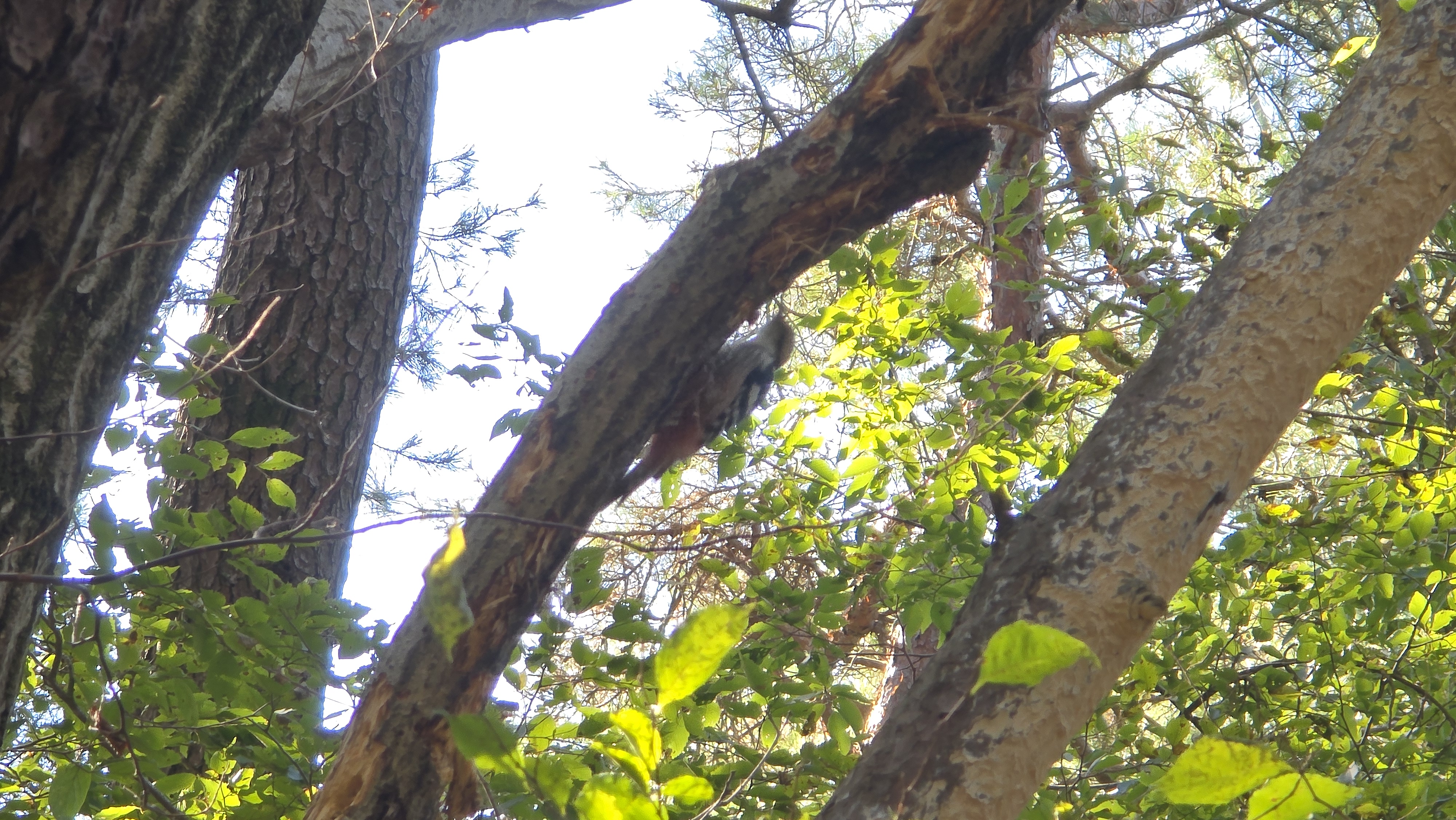 나무줄기를 눈길로 뒤지니 오색딱따구리가 보인다.