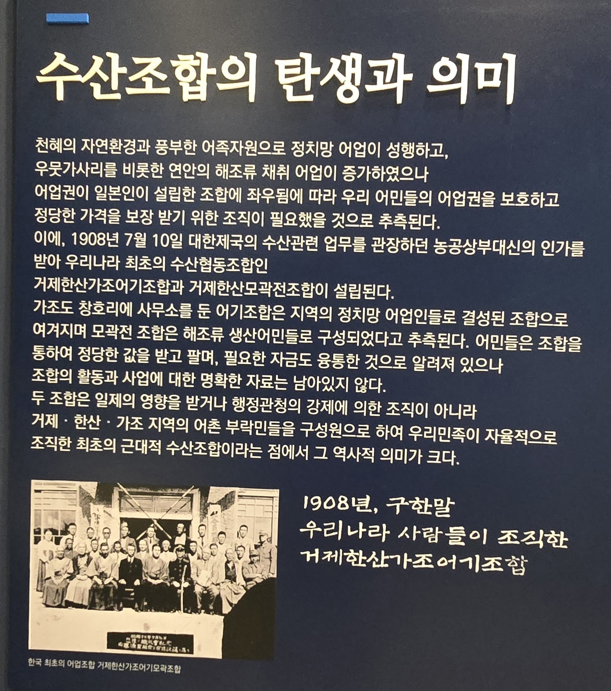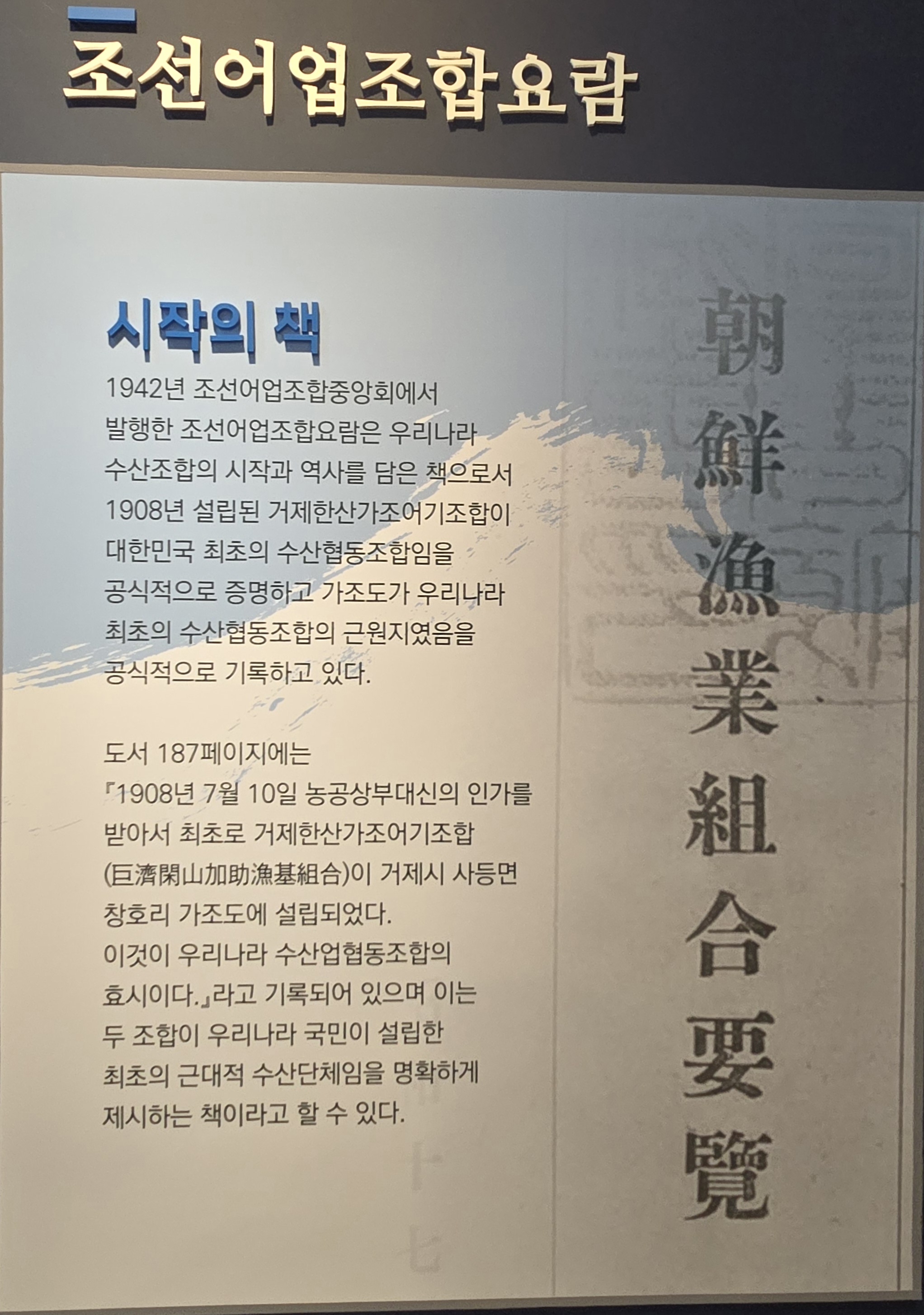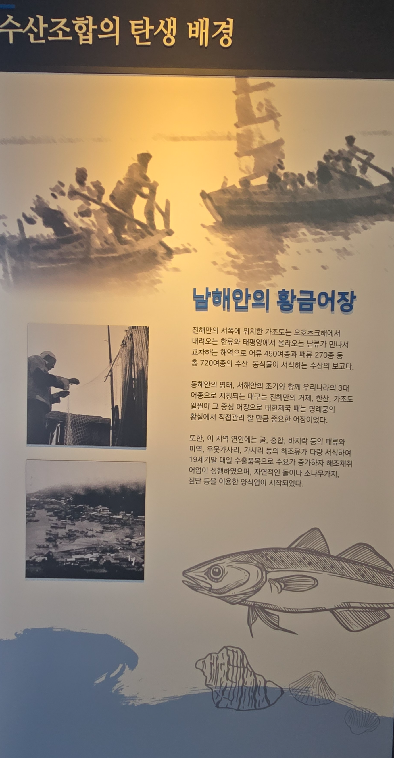 1층 전시실에 수협에 관한 역사적 자료가 전시되어 있고