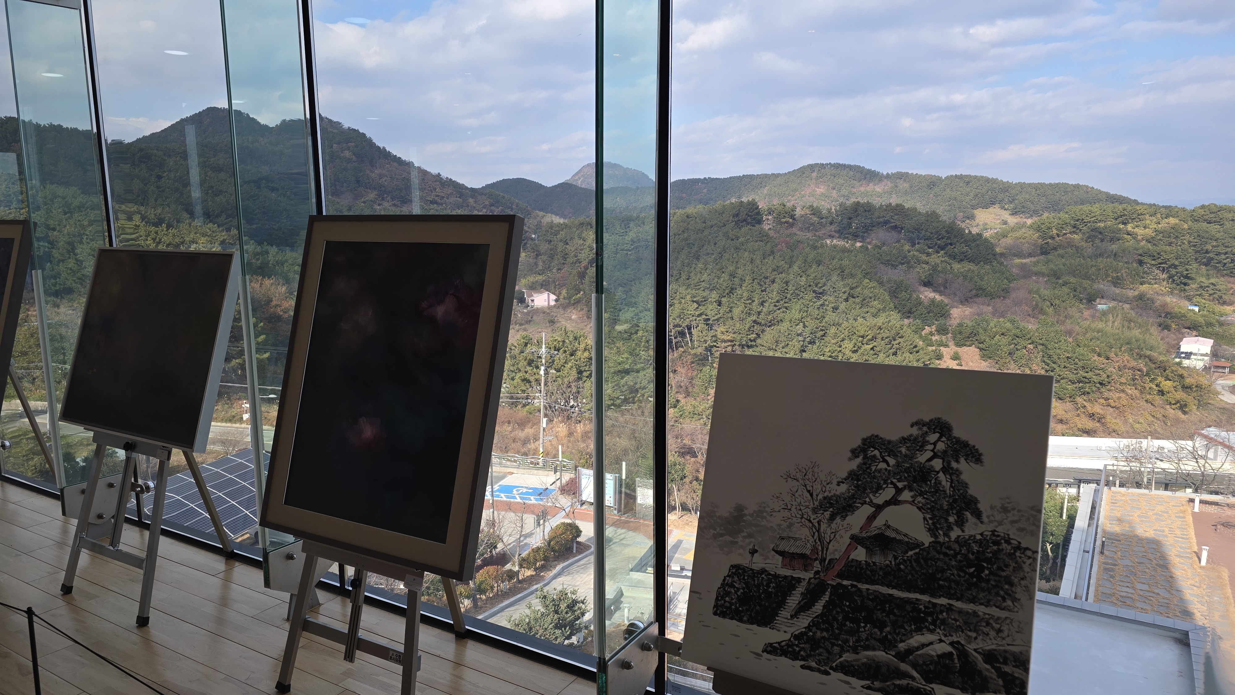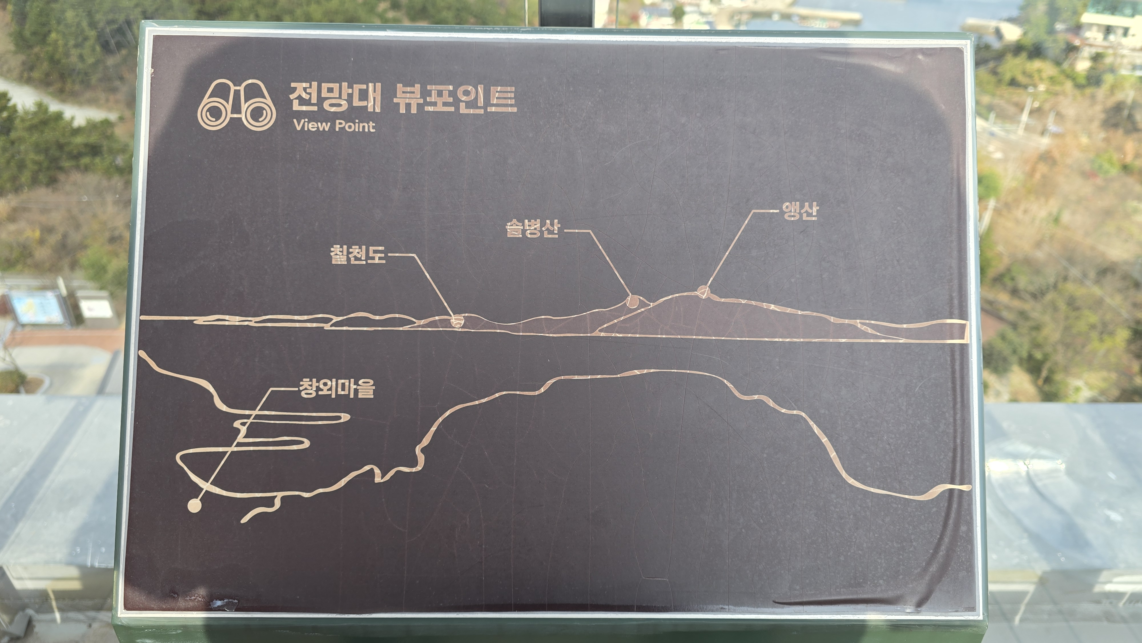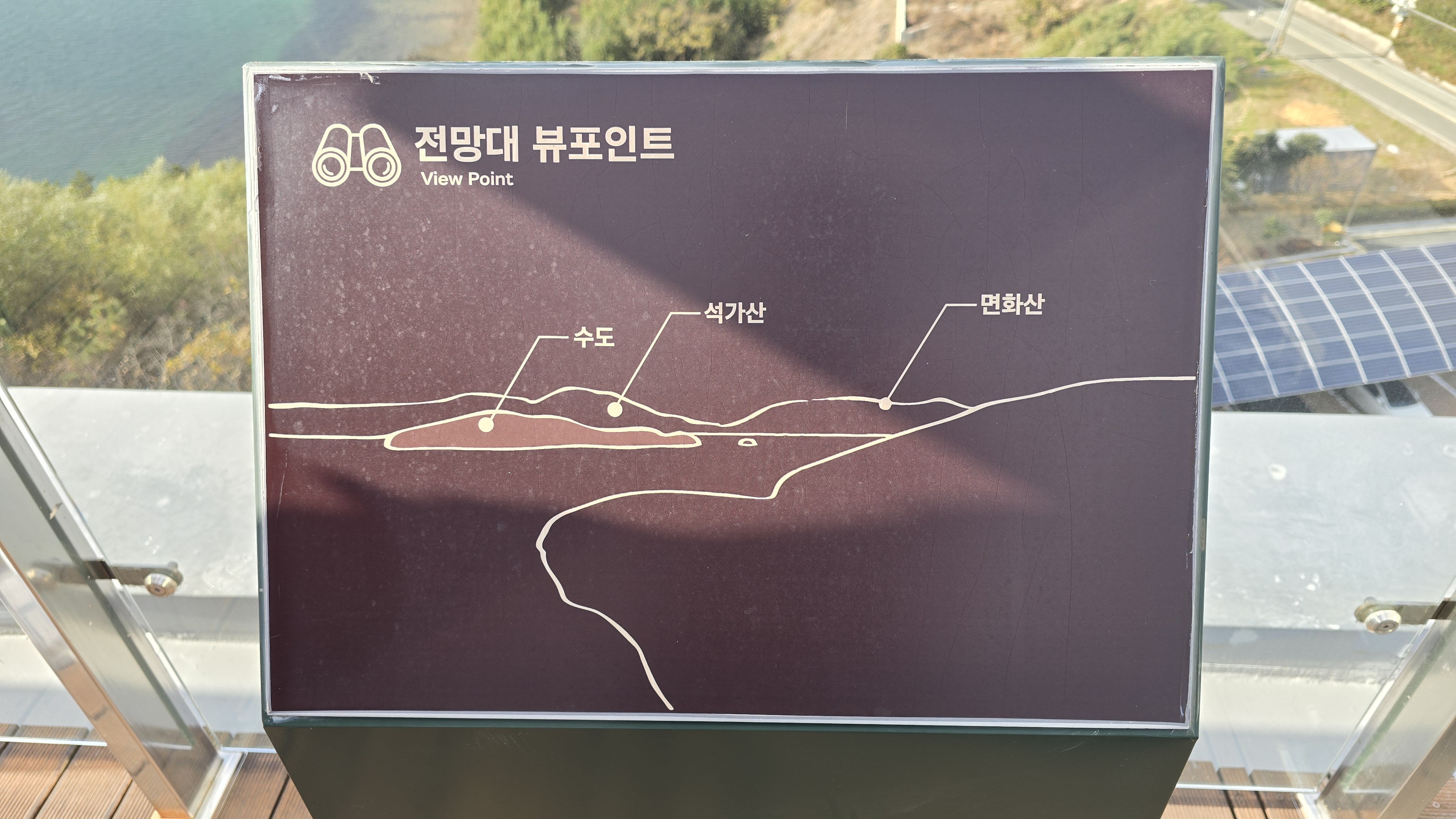 4층의 전망뷰 안내판은 "수도, 석가산, 면화산"이었다.