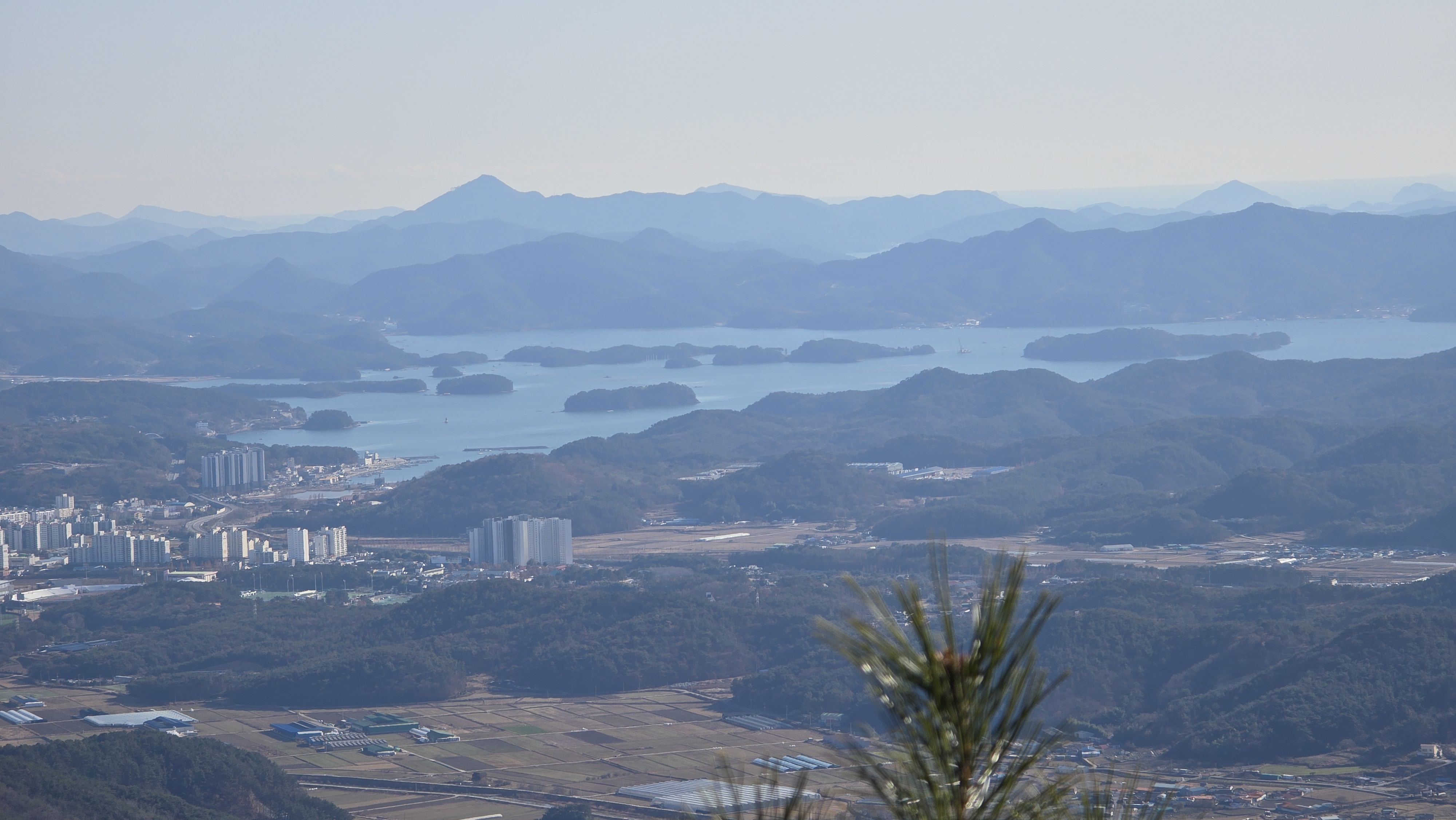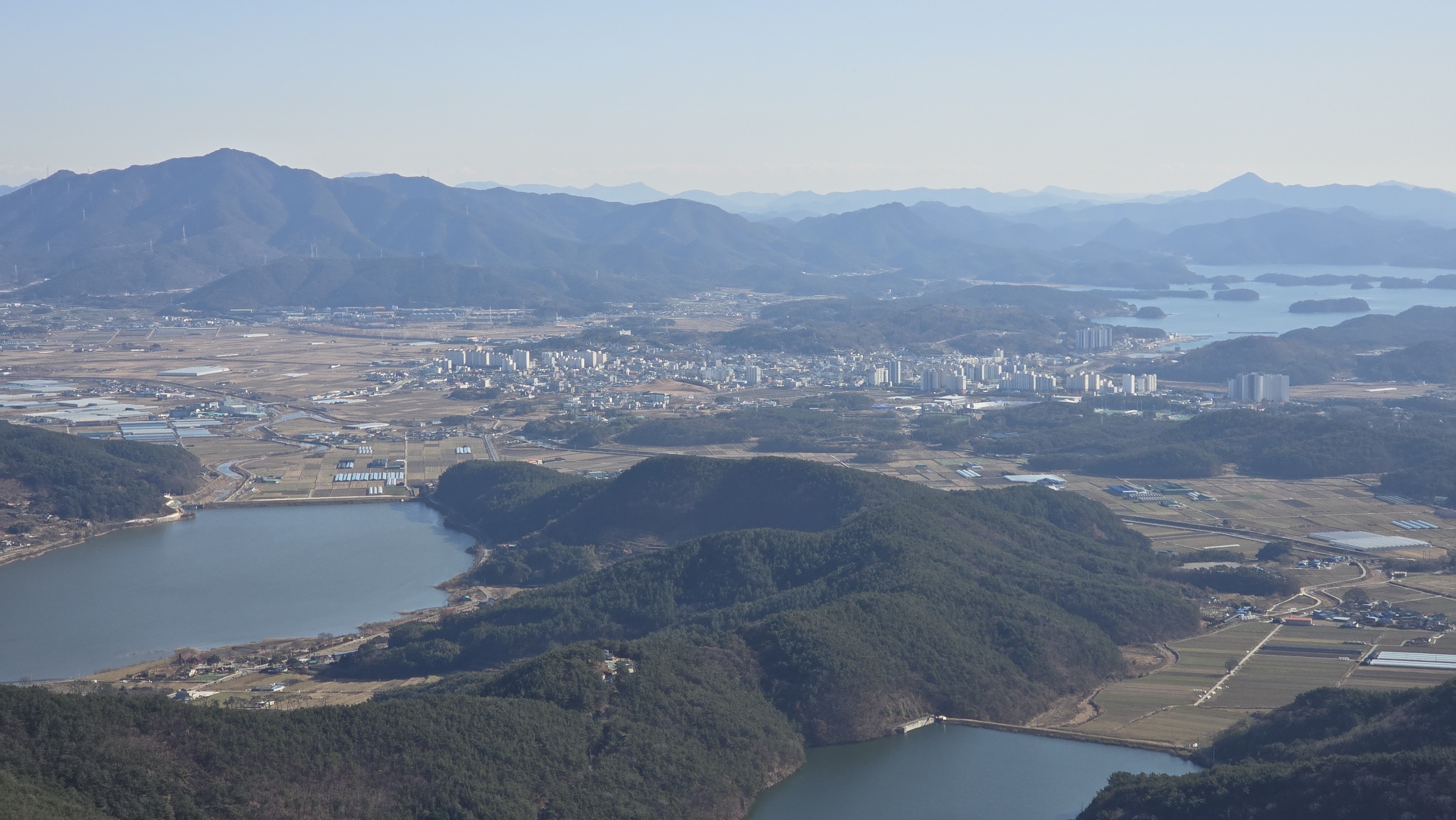 고성읍내와 징검다리섬, 거류산, 벽방산, 미륵산이 한컷에 들어온다.