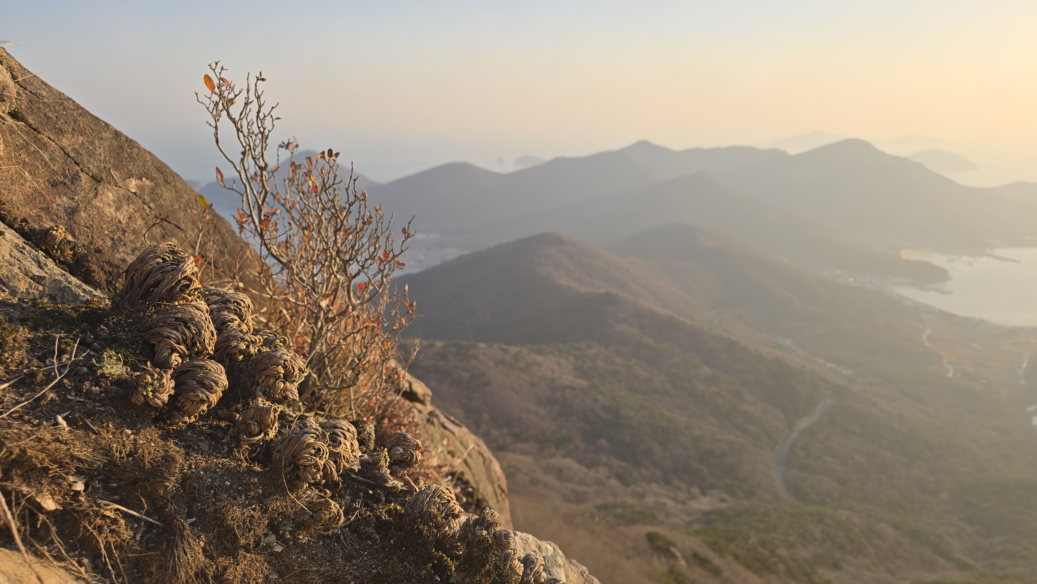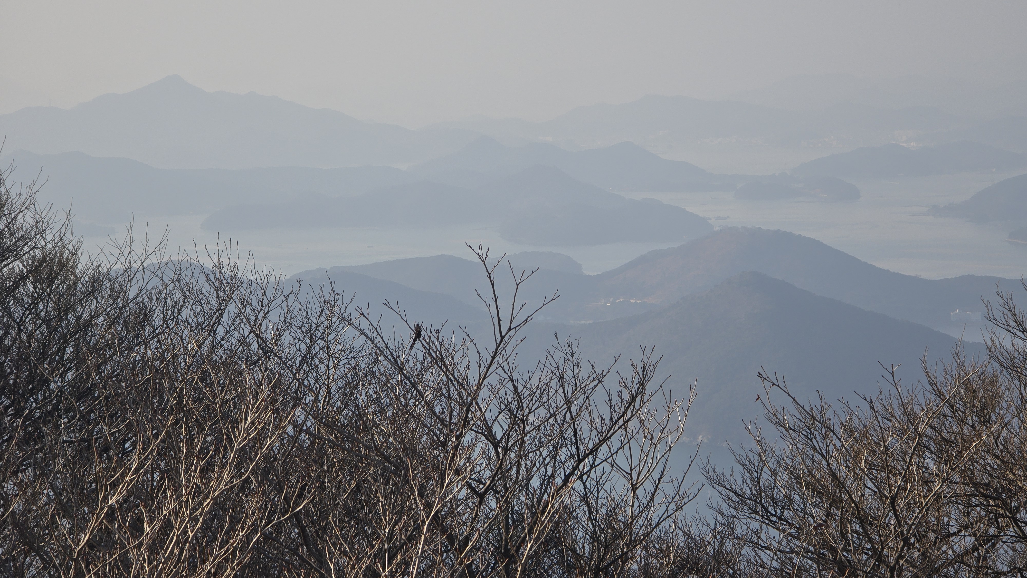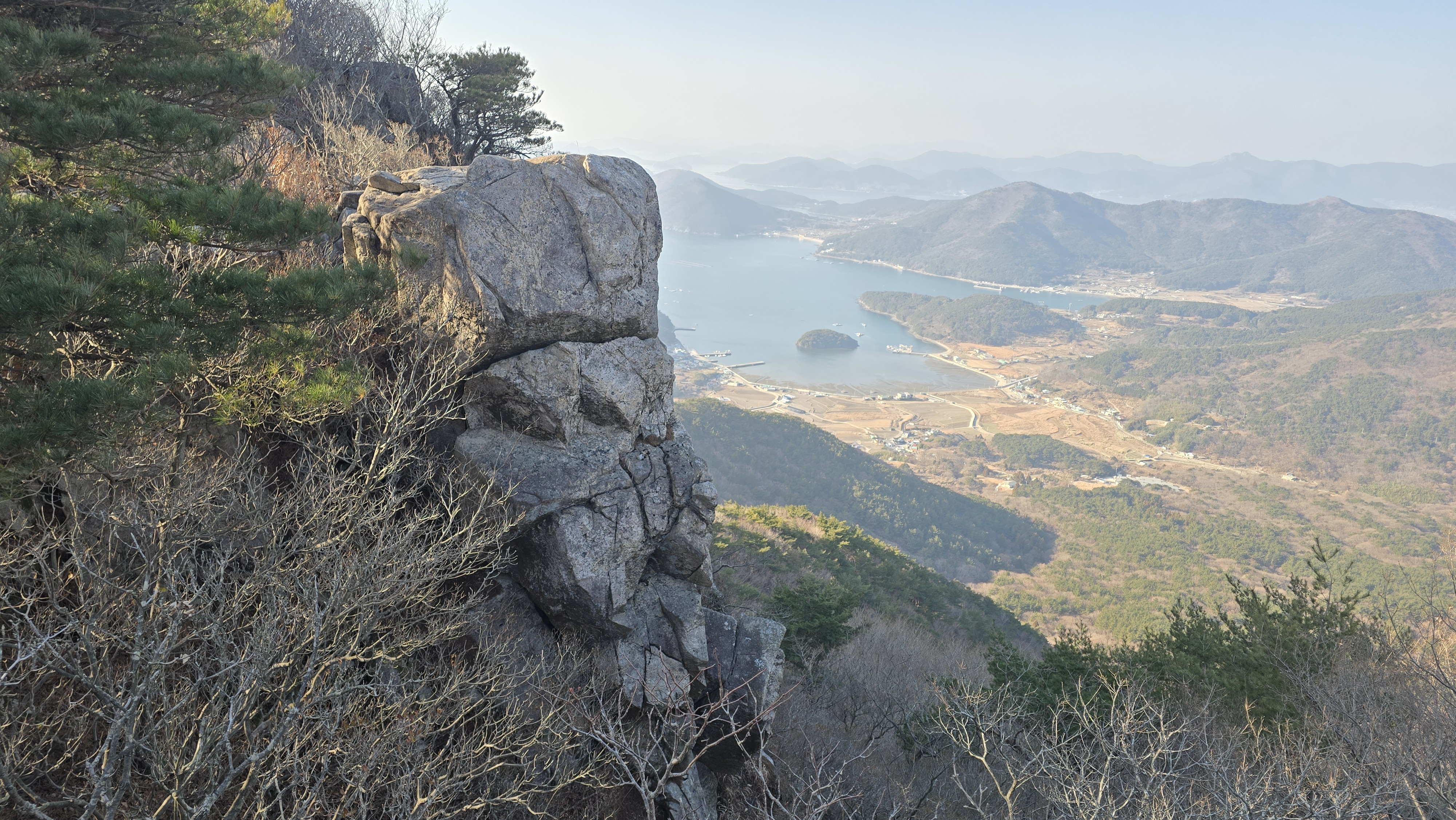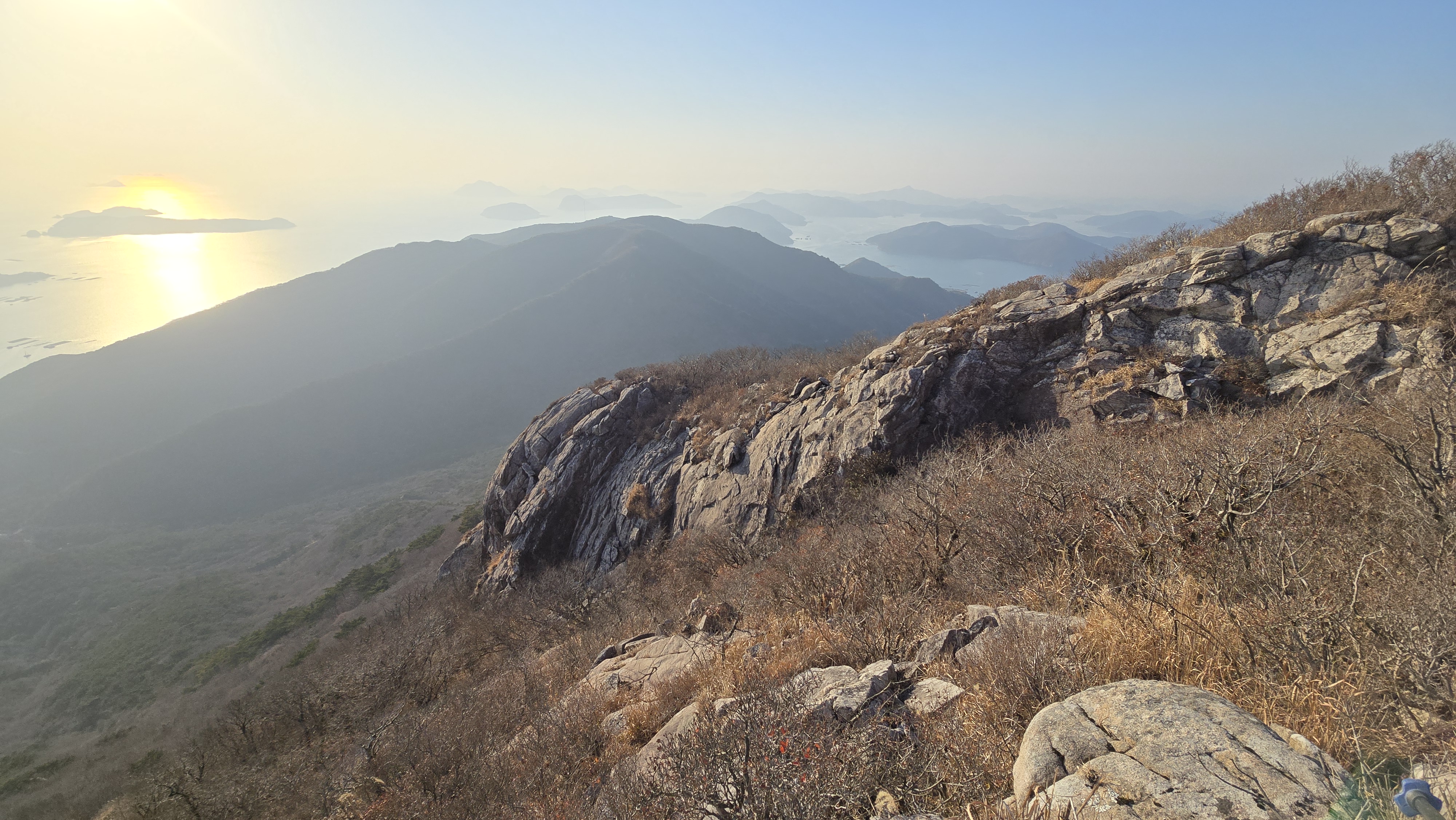 바다를 내려다보면 다도해와 멀리 미륵산도 보인다.