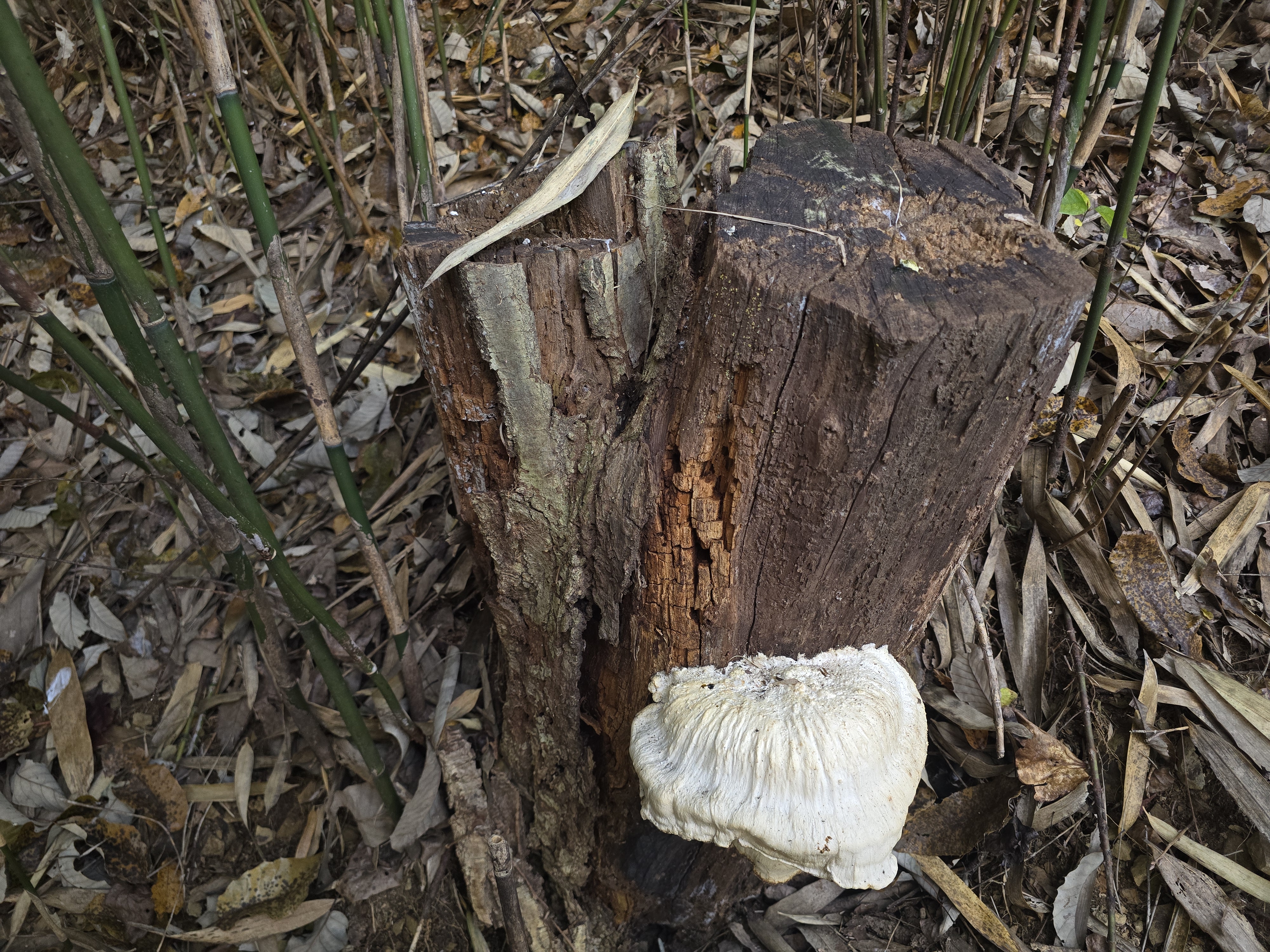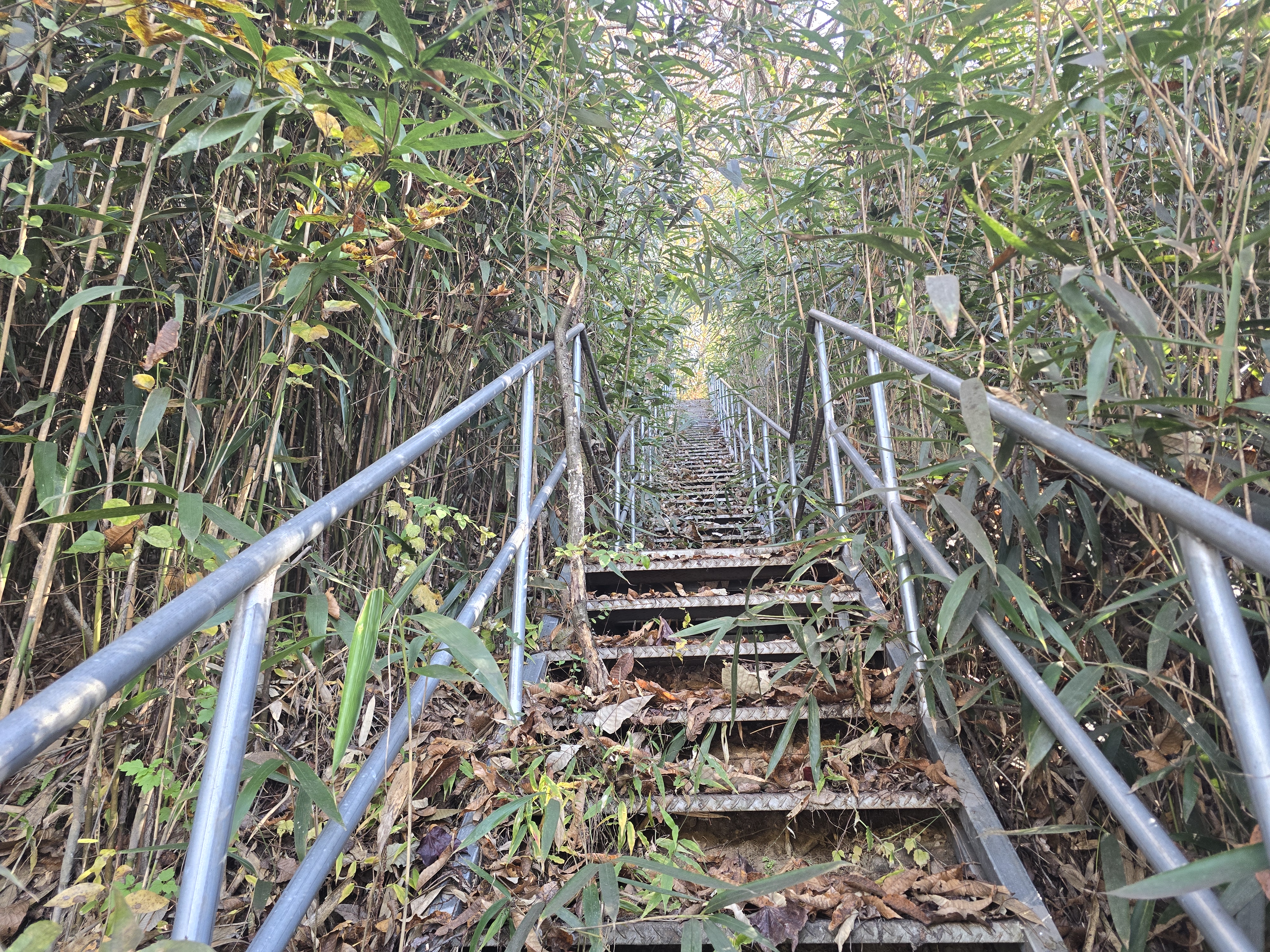 대나무 숲에서 버섯을 보고 오른다.