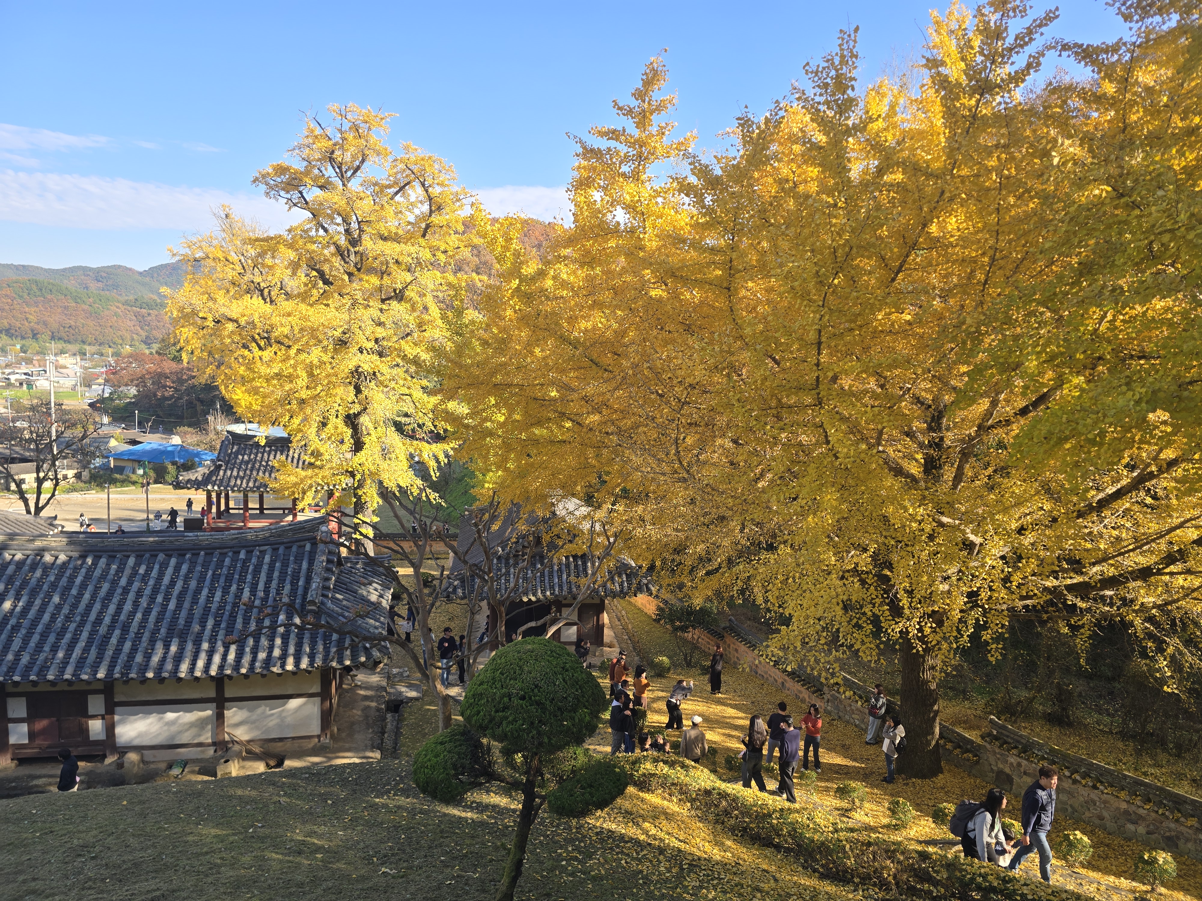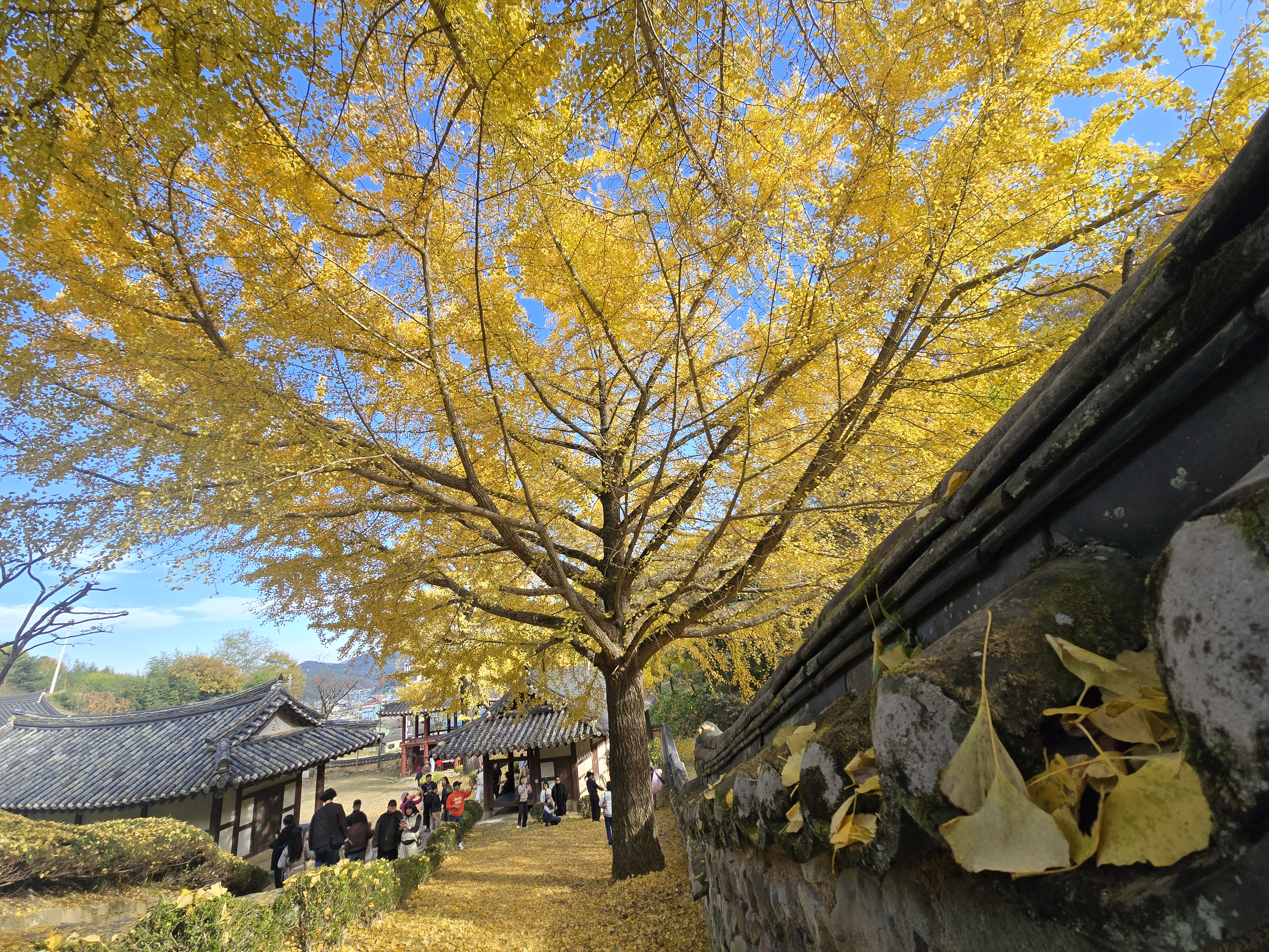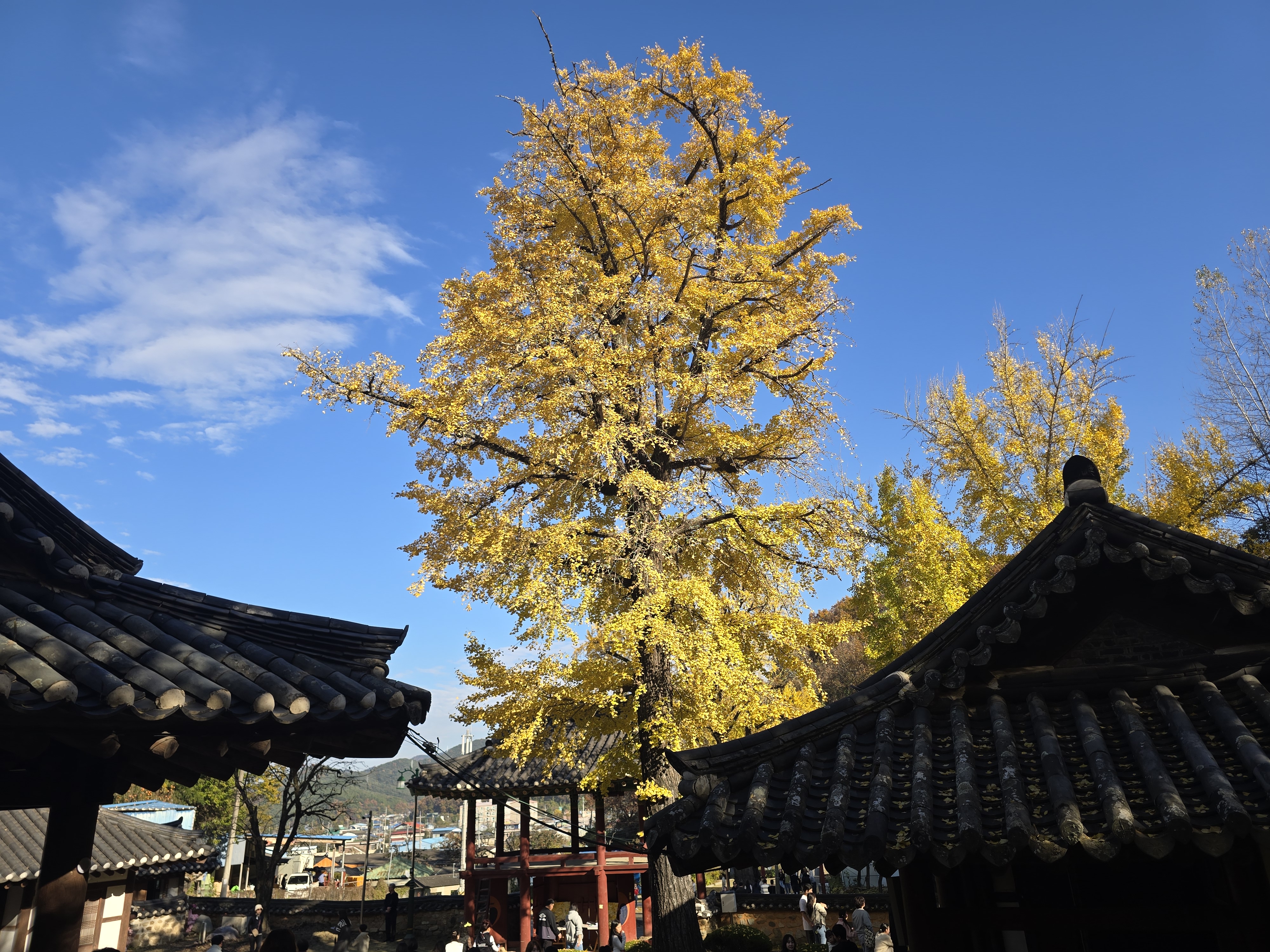 멀리 은행나무가 보이는데 사람들은 인산인해