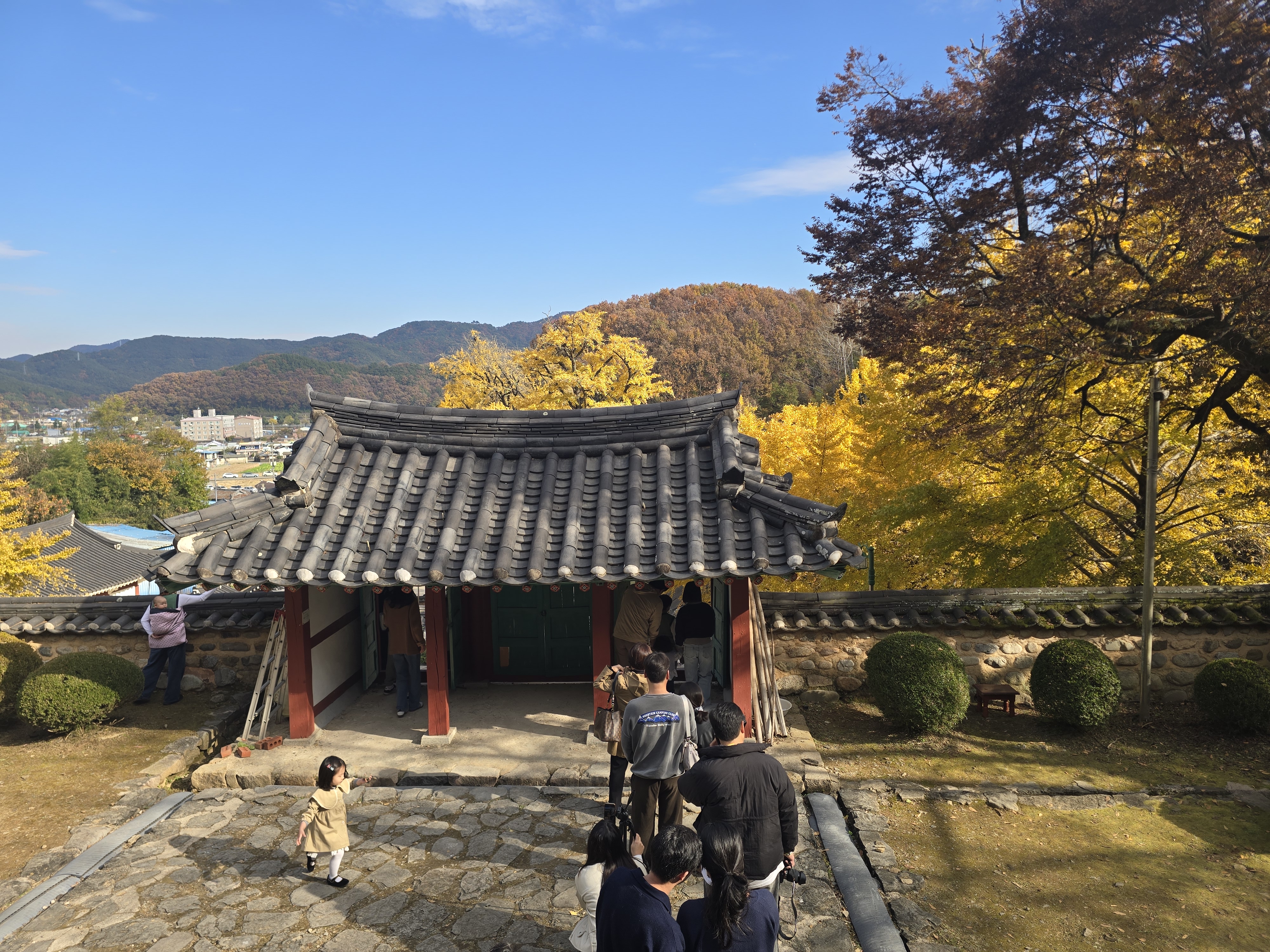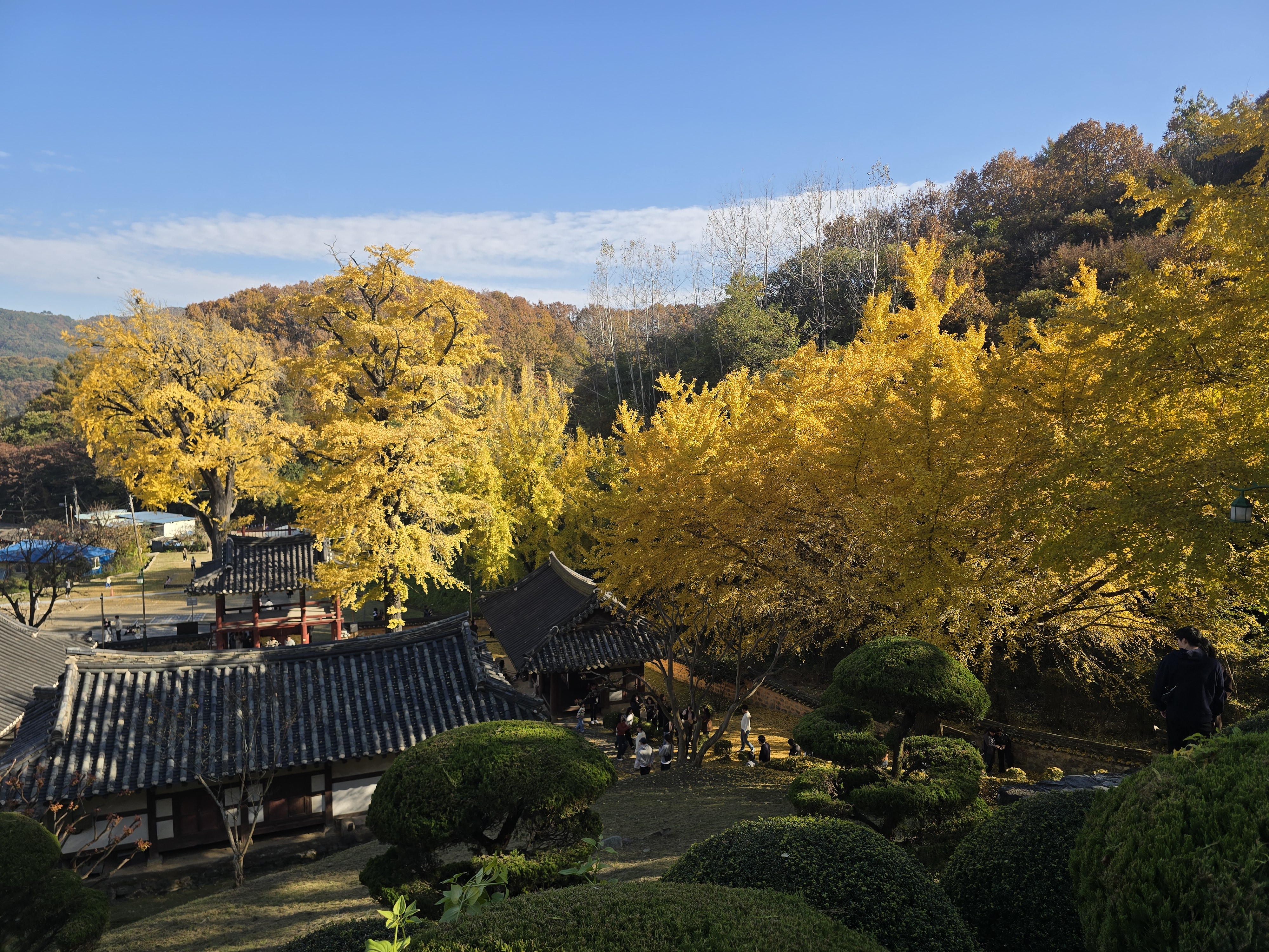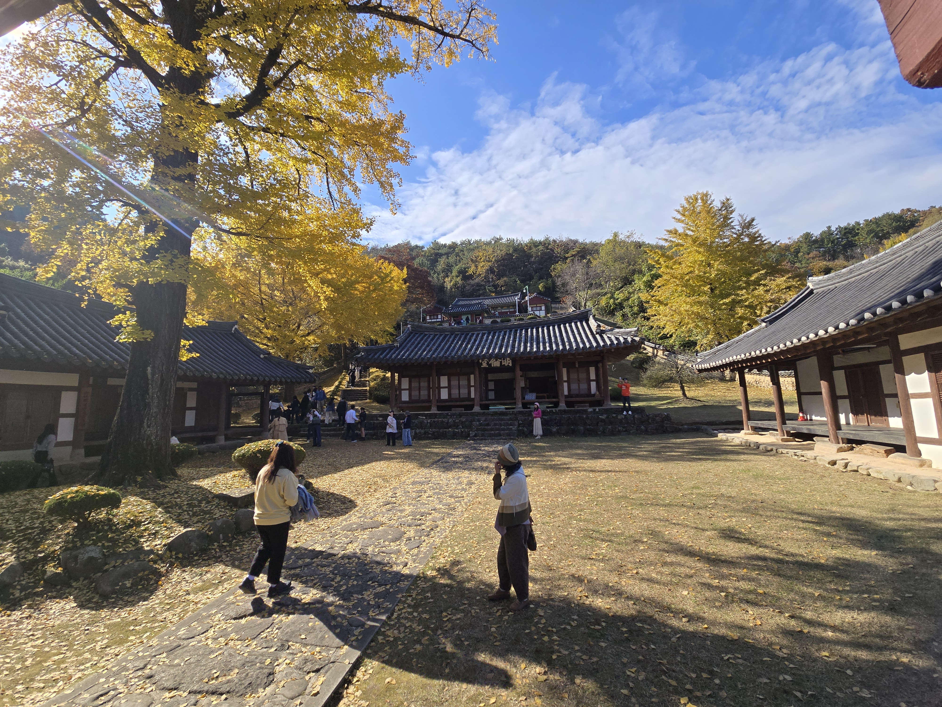 멀리 은행나무가 보이는데 사람들은 인산인해