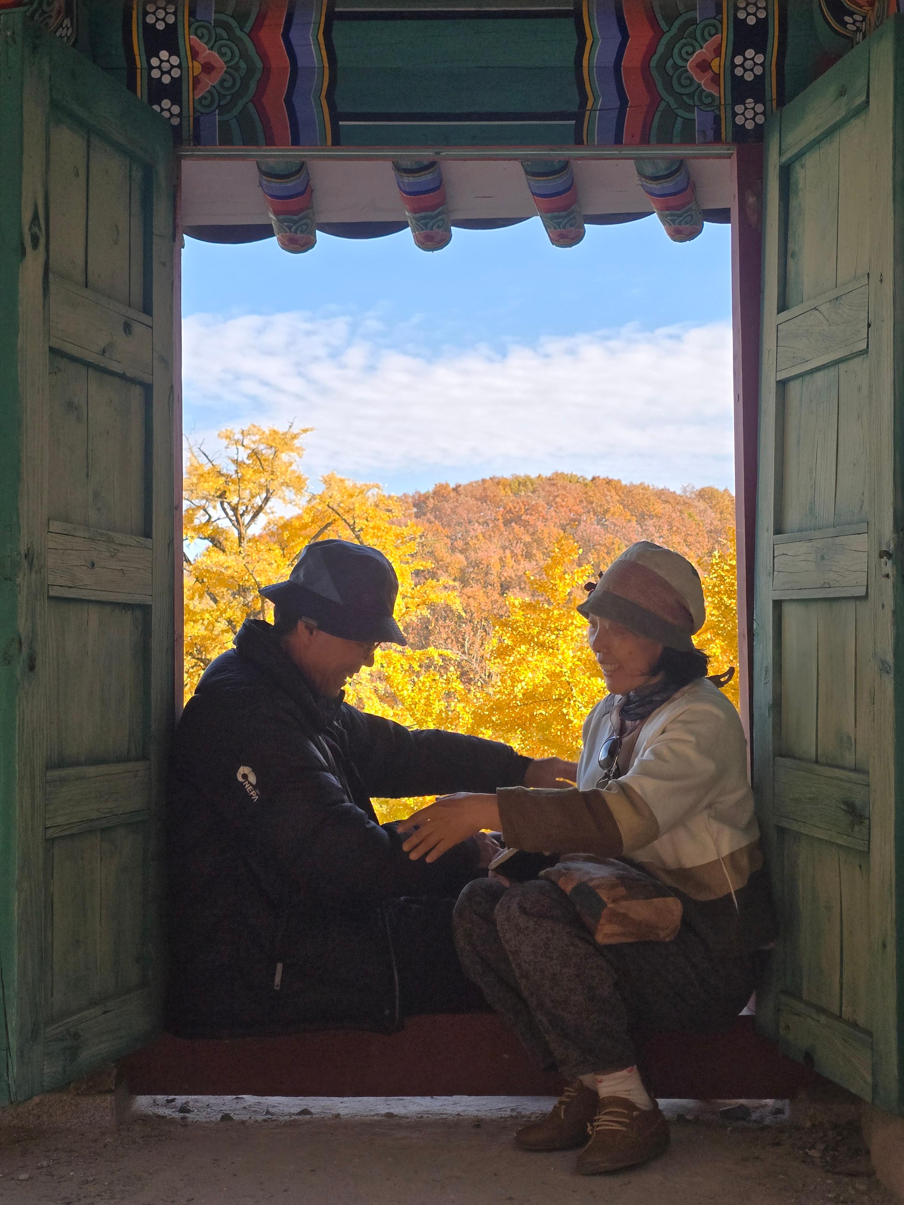 쪽문으로 보이는 단풍이 아름다워 추억을 남기려는 사람들이다.